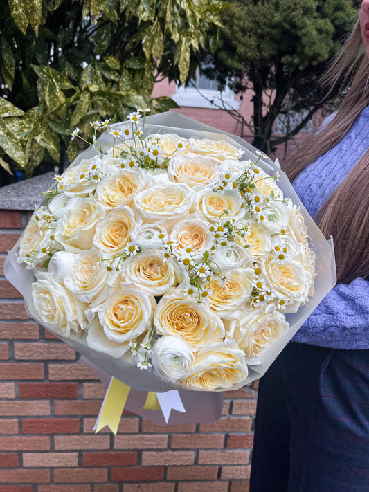 "Just Peachy" Bouquet ( roses, chamomiles, ranunculus)