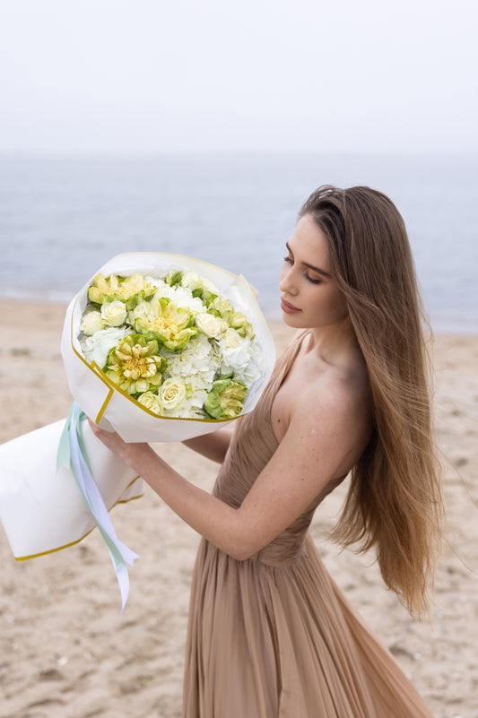 "Lime Freshness" Bouquet (bells of Ireland, daisy, green balls, roses, lisianthus)