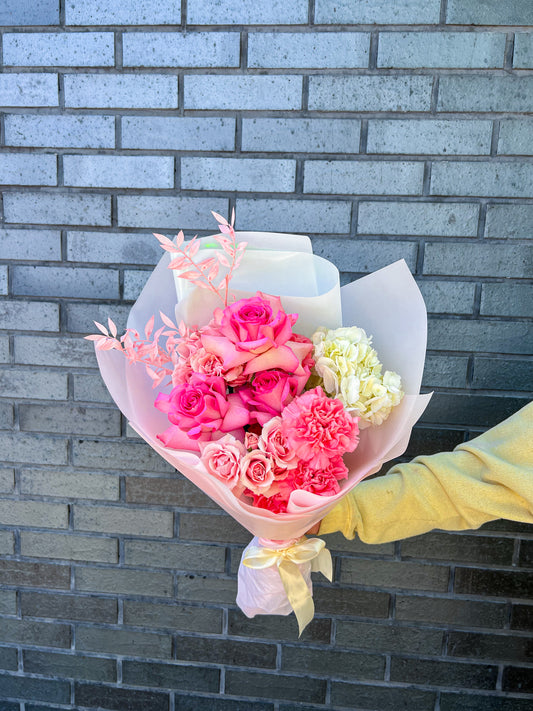 "Pretty in Pink" Bouquet (hot pink roses, hydrangeas , spray roses, baby breath)
