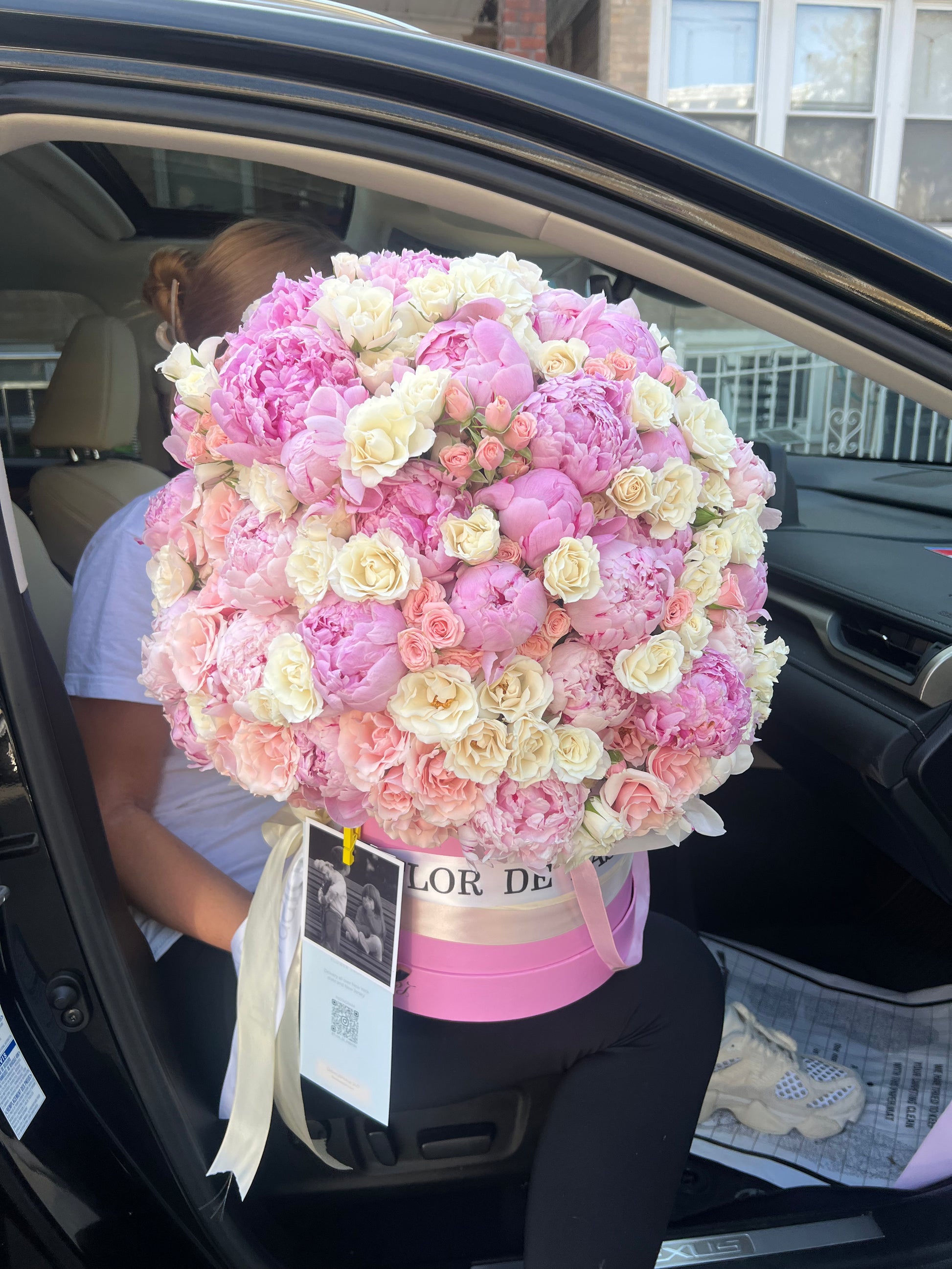 This luxurious box showcases a beautiful arrangement of soft pink peonies and delicate spray roses in white and pink hues. The perfect gift for any occasion, this stunning combination is sure to bring joy and elegance to any recipient. Treat yourself or a loved one to this exquisite floral display.