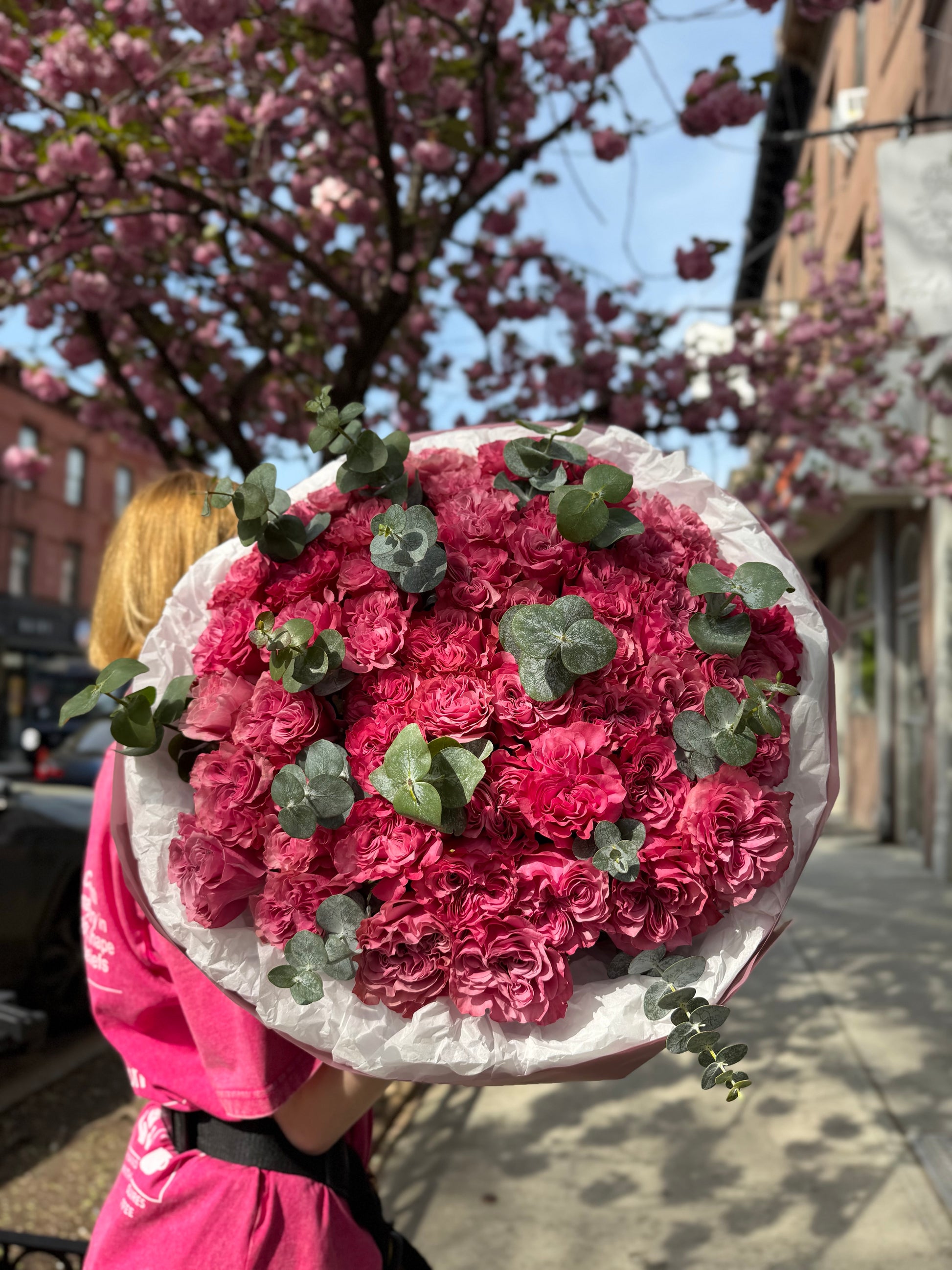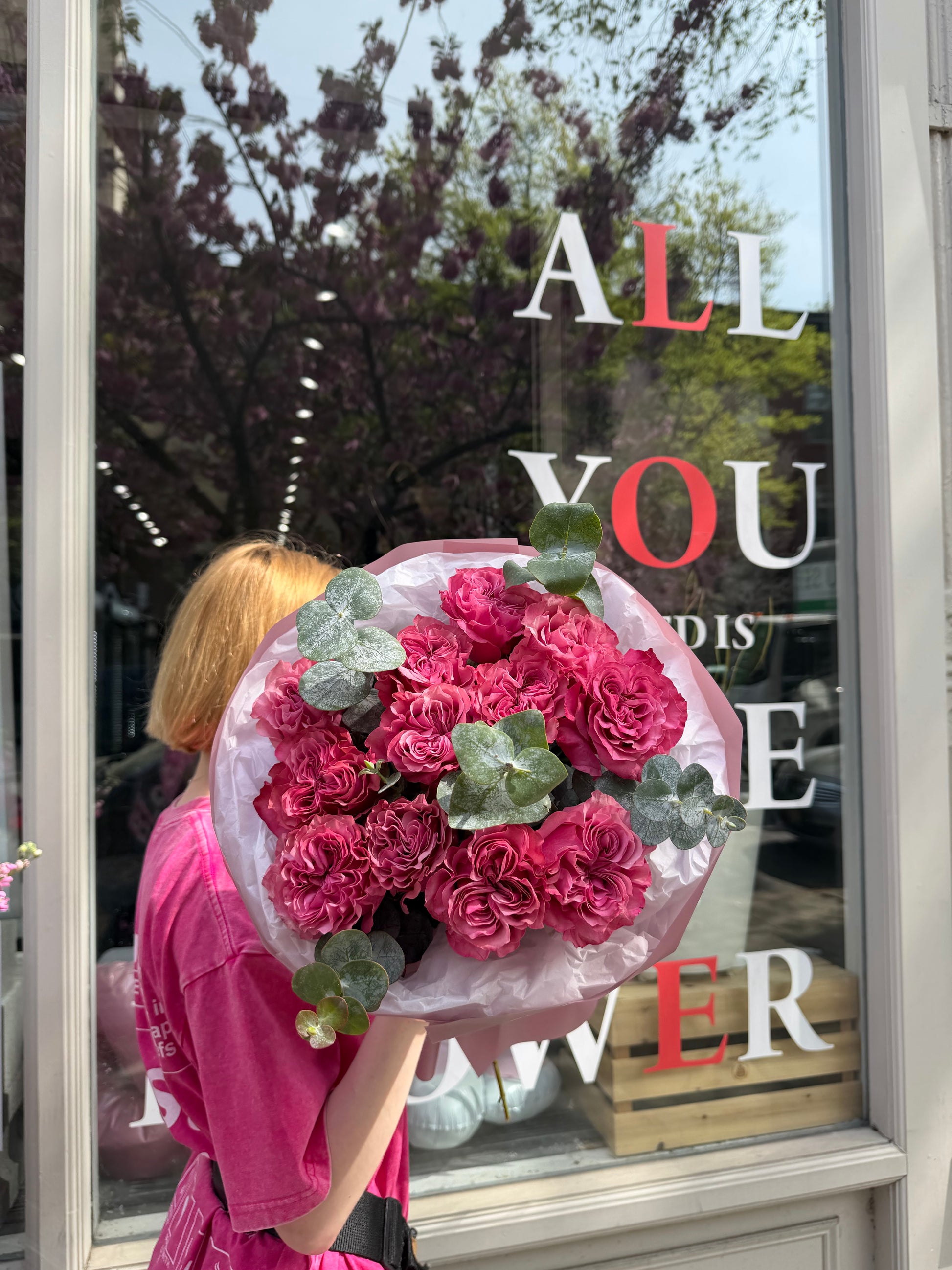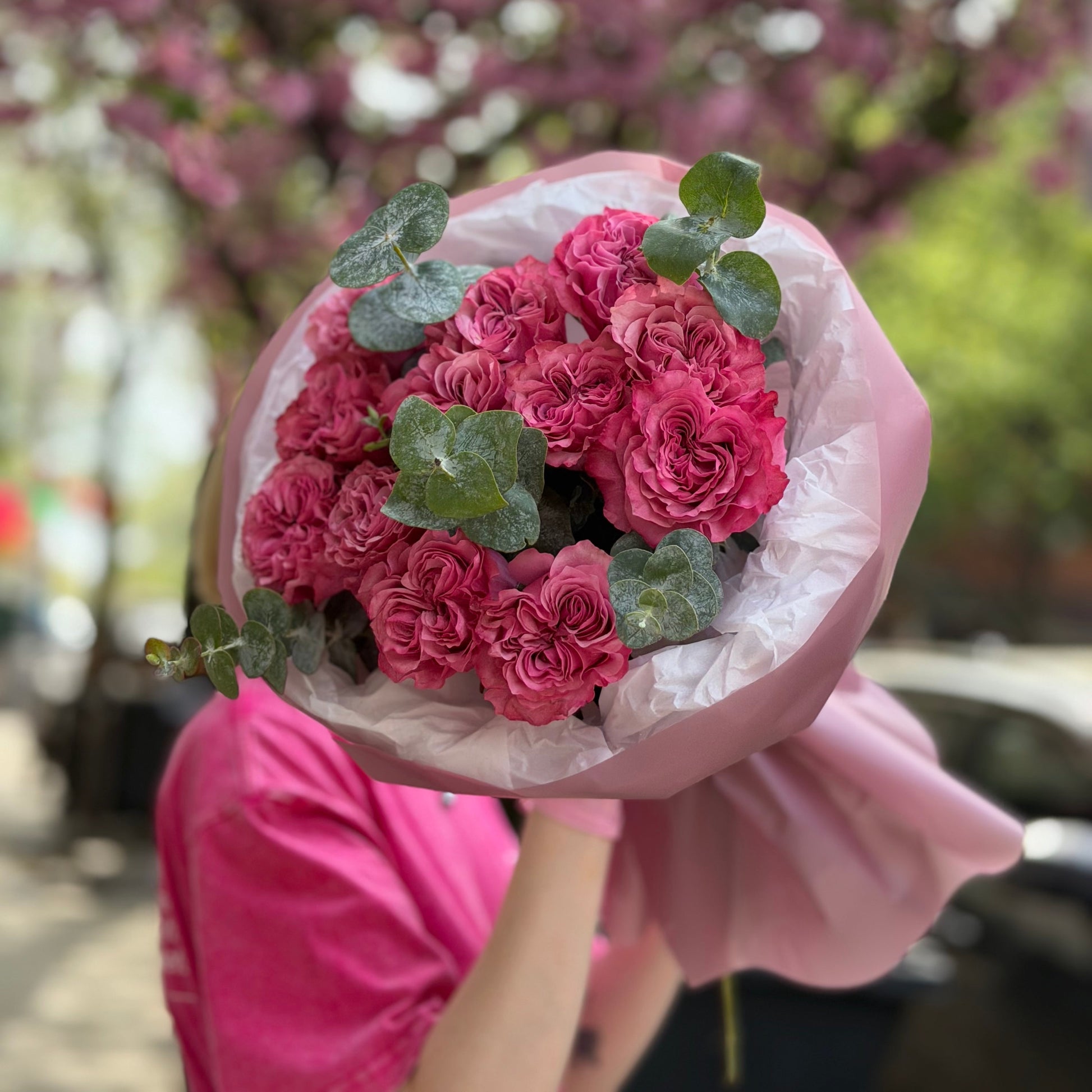 A soft and romantic bouquet of delicate pink roses paired exclusively with fresh eucalyptus. The gentle blush tones and subtle аромат of eucalyptus create an elegant, airy композиция—perfect for heartfelt gifts and special moments.