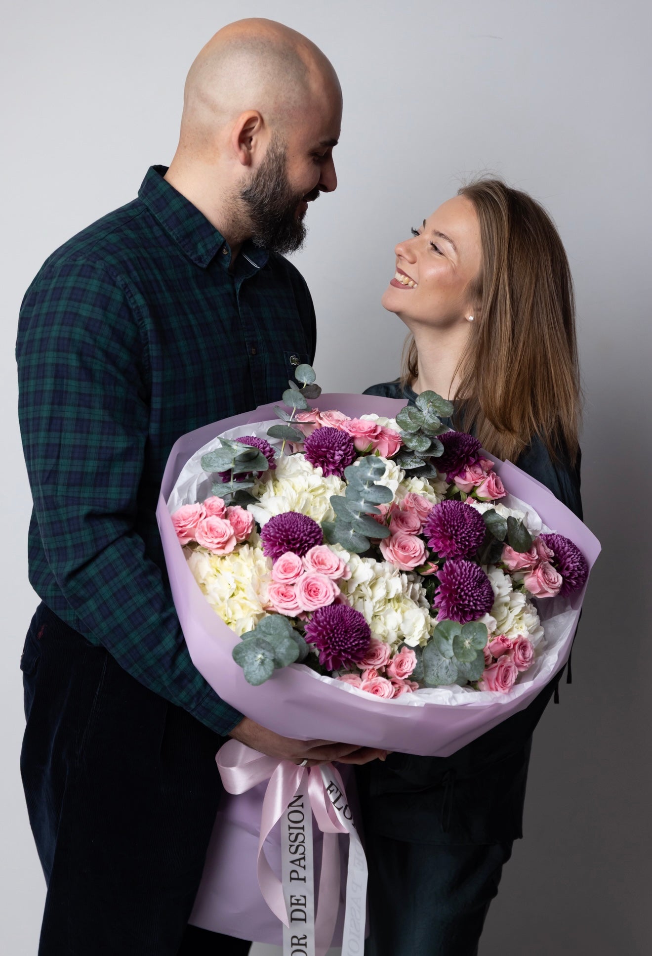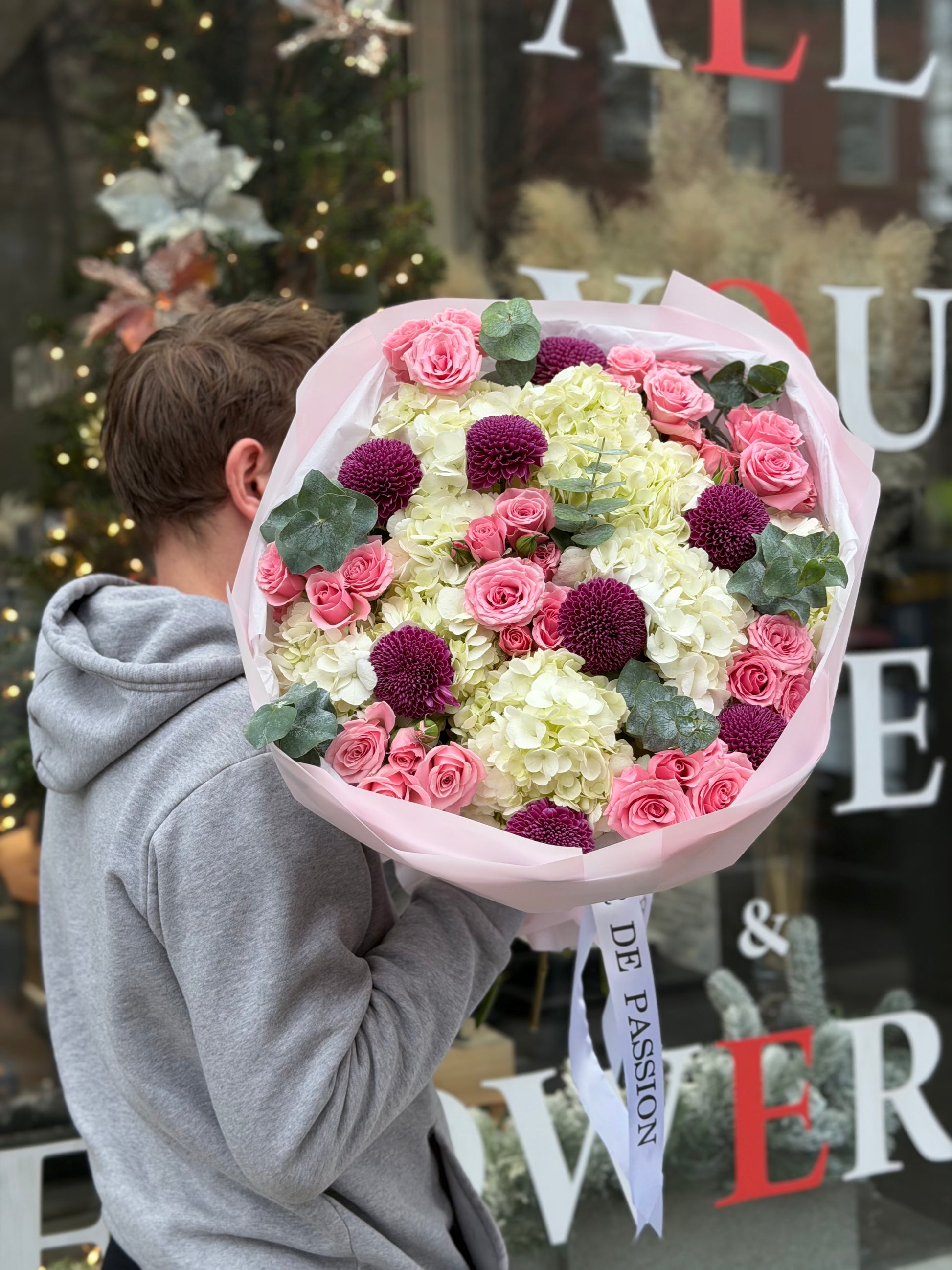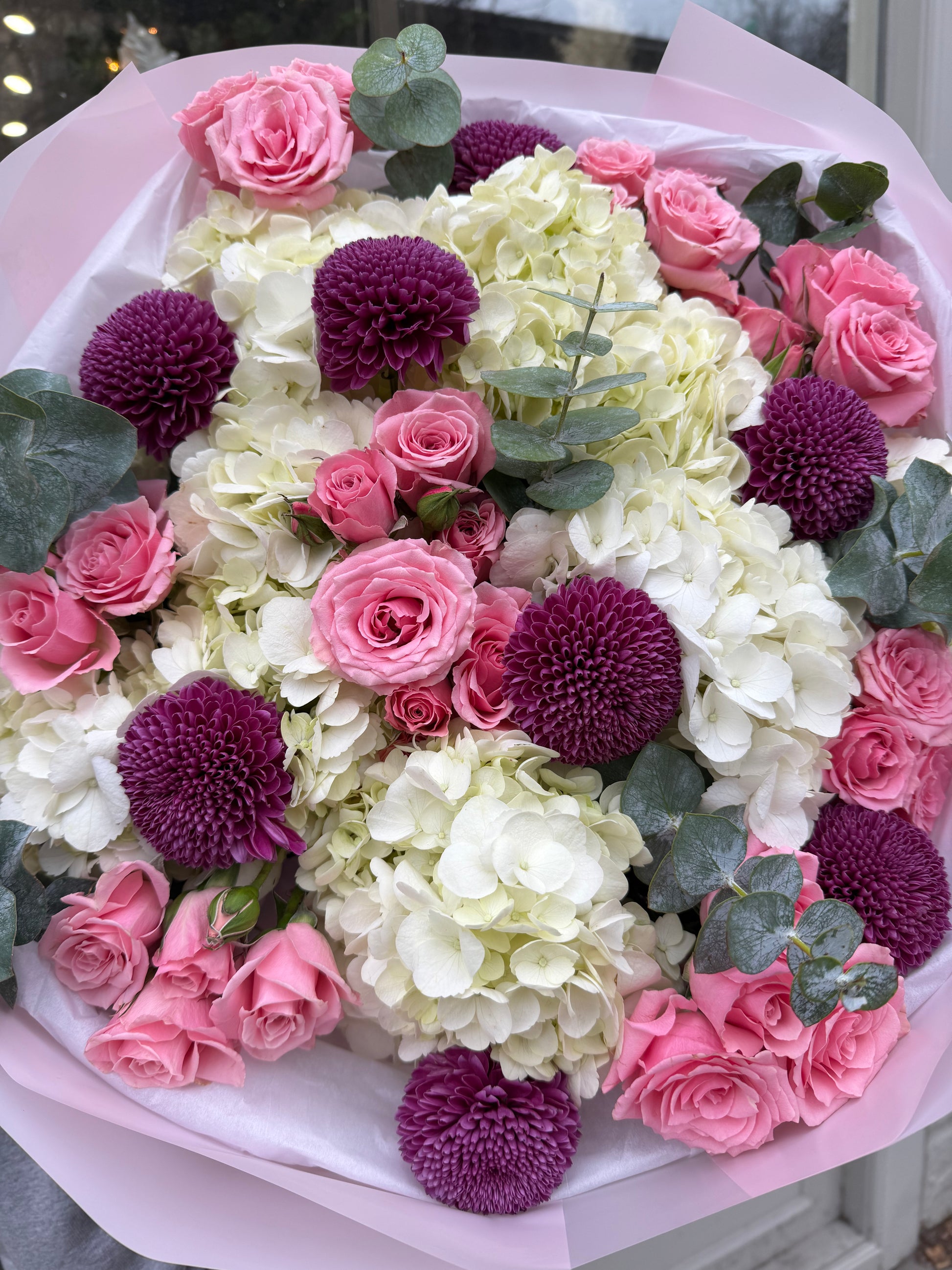 “Elegant Balance" Bouquet (Hydrangeas, Pink Spray Roses, Chrysanthemum, Eucalyptus)