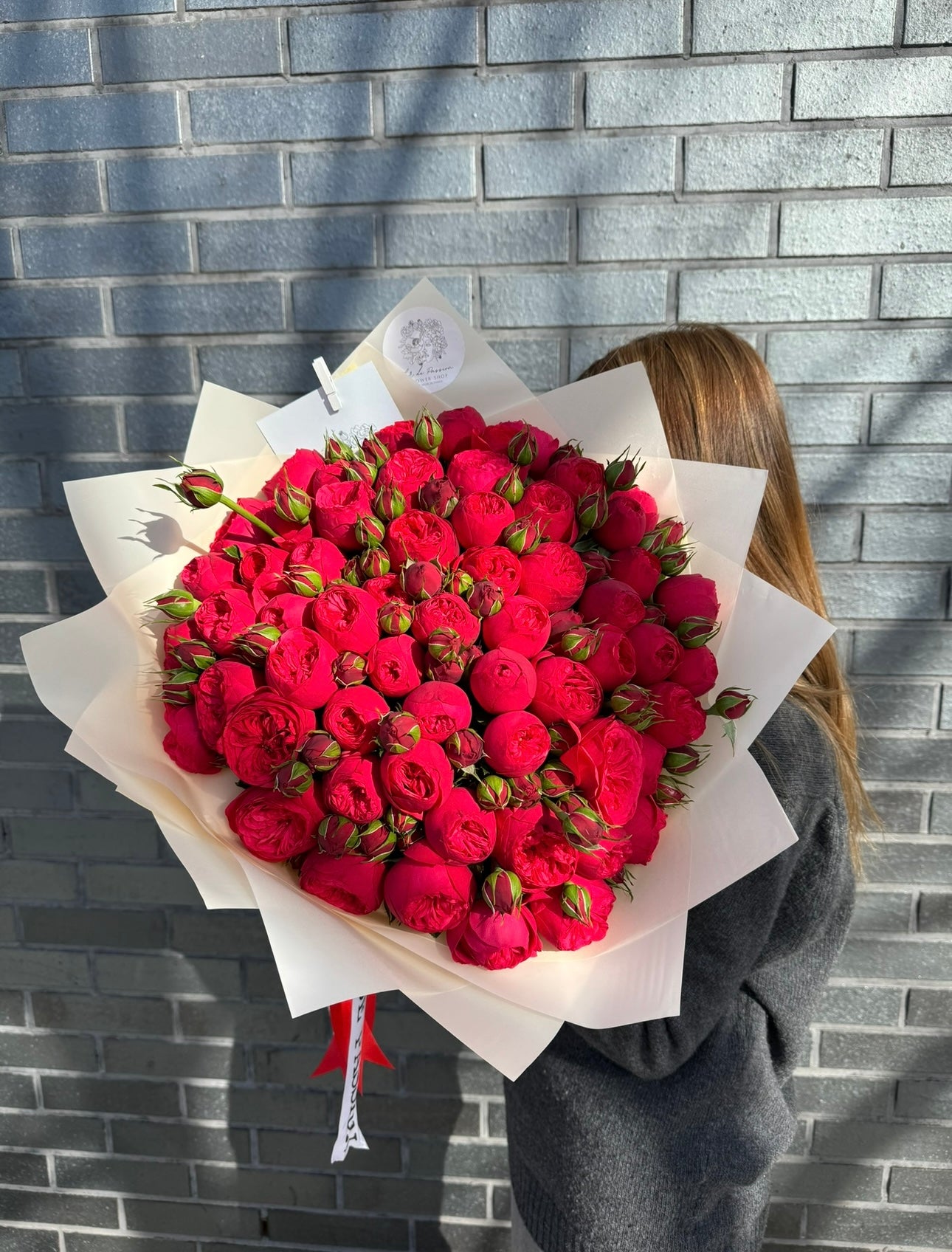 This luxurious and elegant bouquet features premium red piano peony roses. Each flower is hand-selected and arranged to create a stunning monochromatic display. Perfect for any occasion, this bouquet exudes sophistication and romance.