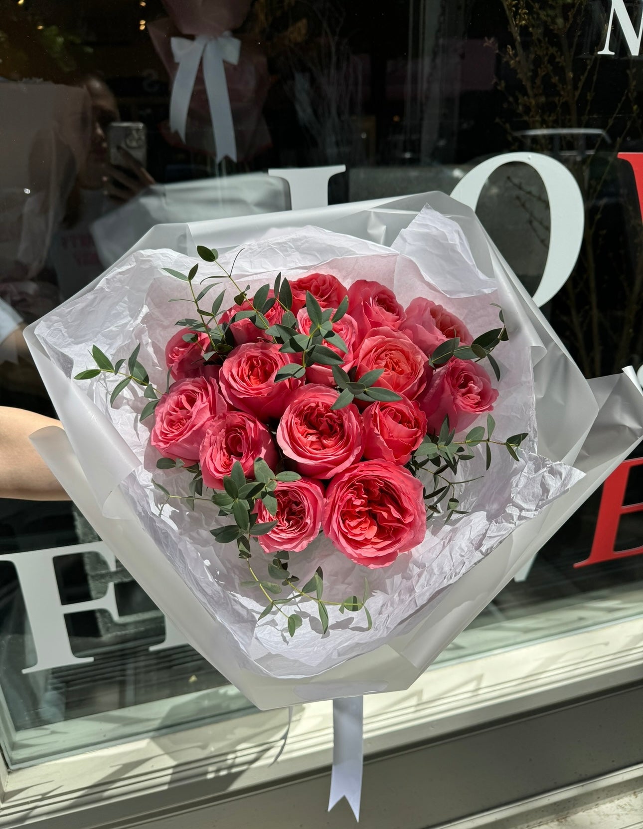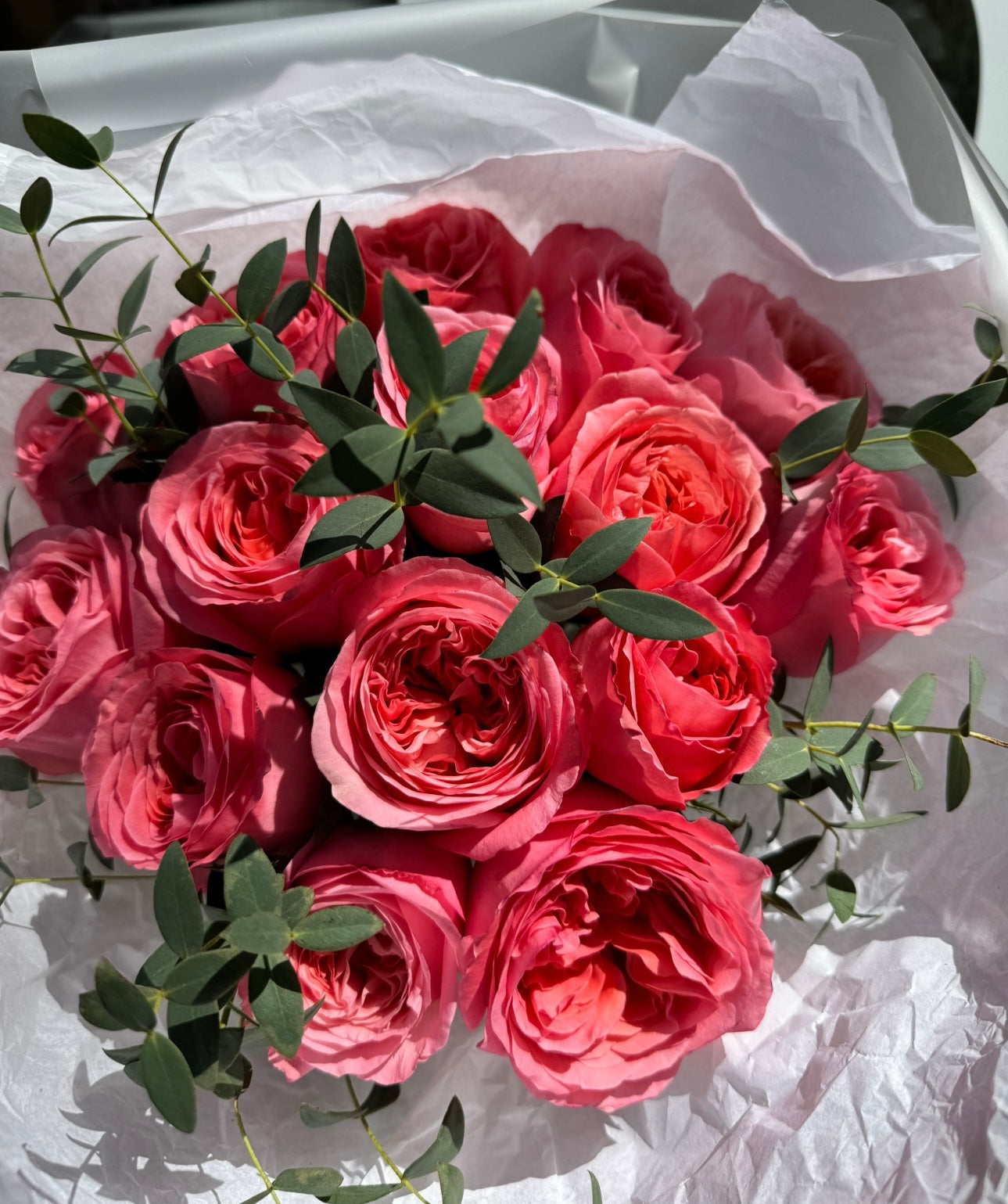 A lush, eye-catching composition of dusty pink and peach shades is the embodiment of exquisite luxury. The undisputed star of this gorgeous bouquet is the garden rose Pink Expression. Its exquisite complex shade and volume will not leave even the most sophisticated connoisseur indifferent. A bouquet of roses will suit a lady with exquisite taste who knows exactly what she wants.