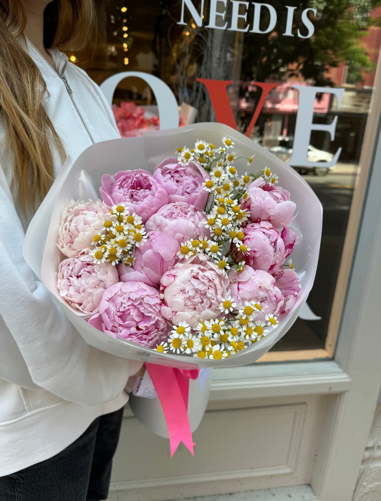 This beautiful bouquet features delicate pink peonies paired with chamomiles, creating a stunning blend of colors and textures. The peonies add a touch of elegance, while the chamomiles bring a sense of tranquility. Perfect for any occasion, this bouquet is a sure way to brighten up any room and bring a smile to your loved one's face.