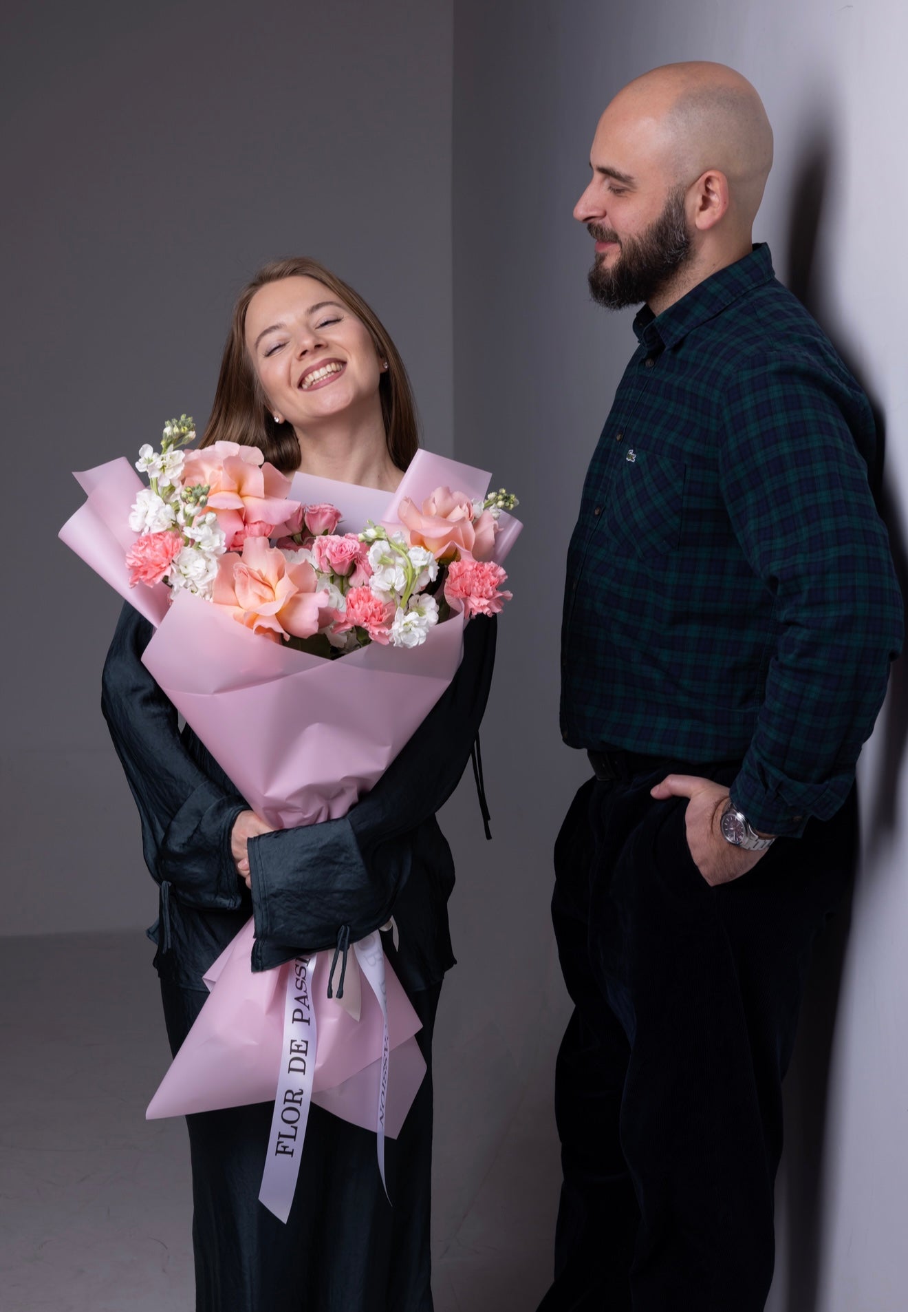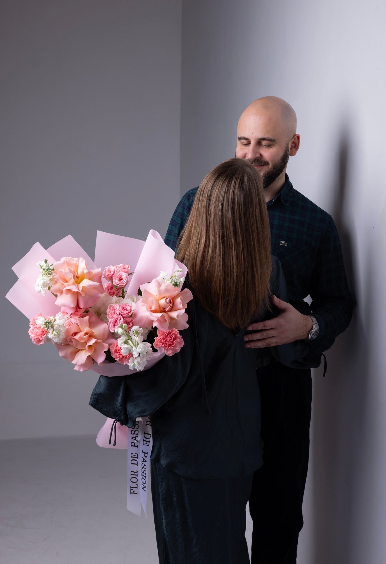 "Strawberry Mousse" Bouquet (French Rose, Hydrangea, Stocks, Spray Roses, Carnations)
